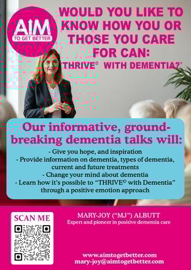 We all hope for a day when researchers can find effective treatments and, ultimately, a cure for the many conditions that come under the umbrella of “dementia”. But in the meantime, at Aim to Get Better, we passionately believe that it is possible for people living with dementia to THRIVE.